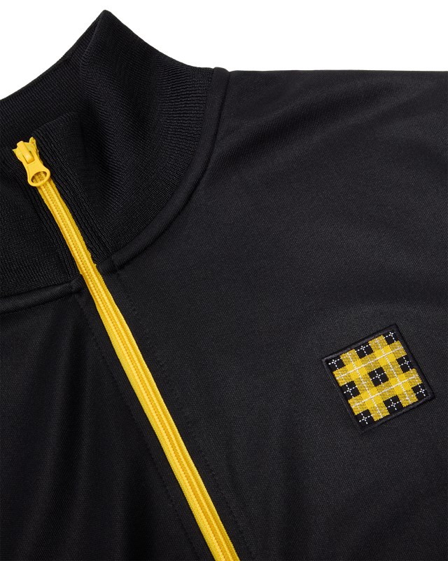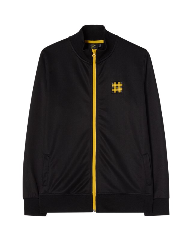 Svart track jacket med en vävd patch i rutmönster.