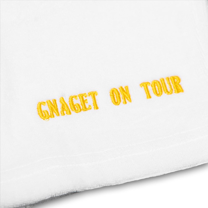 Vita shorts i somrigt frottétyg. Snörning i midjan med metalländar samt fickor på sidorna. På benen finns en gul flagga samt "Gnaget on Tour" broderat.