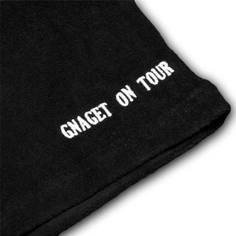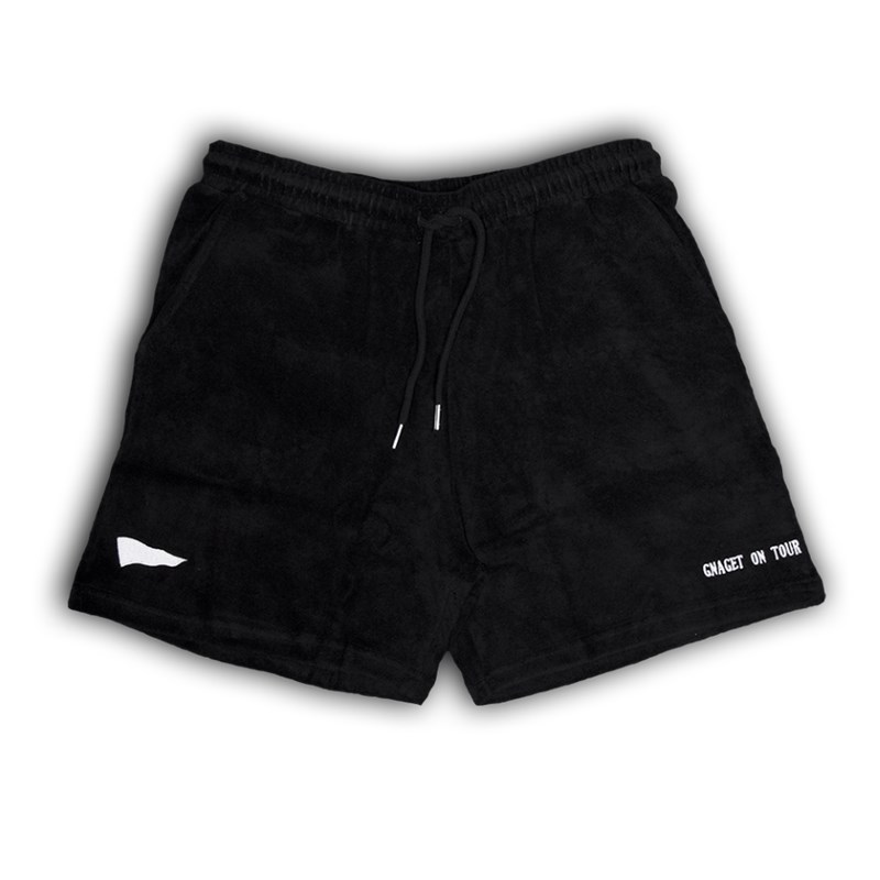Svarta shorts i somrigt frottétyg. Snörning i midjan med metalländar samt fickor på sidorna. På benen finns en vit flagga samt "Gnaget on Tour" broderat.