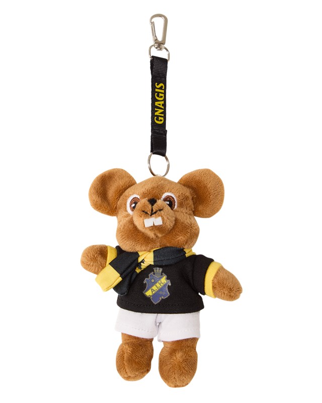 Nyckelring med maskoten Gnagis. Figuren bär AIK:s klassiska färger – svart tröja med klubbemblemet, vit nederdel och en matchande halsduk. Fästet har en praktisk metallhake och ett band med texten GNAGIS i gult. En perfekt accessoar för nycklar, väskan eller ryggsäcken.