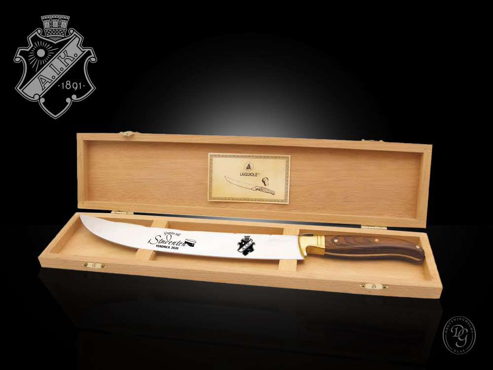 Sabreringssabel för att öppna champagne flaskor effektfullt. Detta snygga svärd graveras på bladet. Laguiole har en helt oslipad egg vilket gör att den är helt optimal för att få till raka och snygga snitt på champagneflaskan.